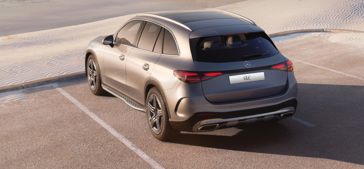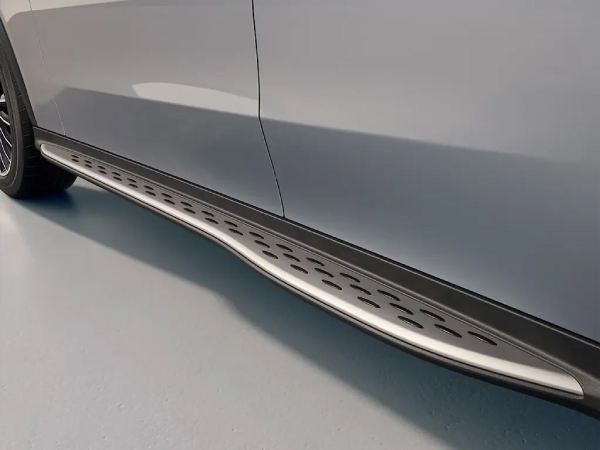 Los estribos opcionales en efecto aluminio realzan la silueta SUV de la GLC 300 4MATIC y facilitan el acceso al interior. Su diseño «Shaped» combina estética y funcionalidad: son más estrechos en la parte delantera y se ensanchan hacia la zona trasera, creando un efecto visual dinámico y armonioso.